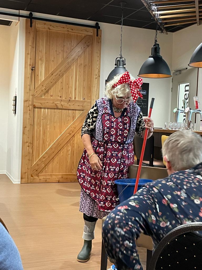 Voor de pauze zong Griet oude Friese liedjes. Ze liet ook wat liedjes horen die ze zelf geschreven heeft. In de pauze was er voor een ieder koffie met gebak. Men zat nog volop te praten, toen er een als schoonmaakster verklede Griet binnen kwam. Deze act werkte behoorlijk op de lachspieren. Met haar wc poetsdoek kon ze ook prima haar neus schoonvegen.