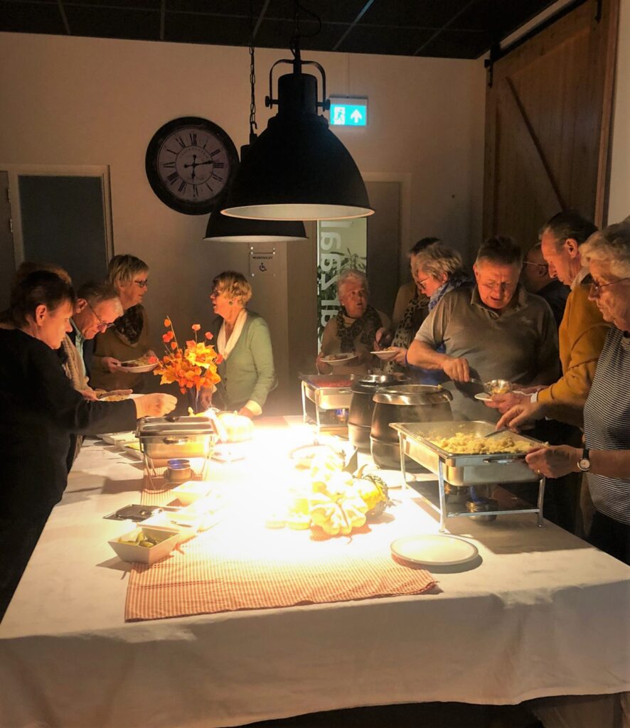 Voor deze maaltijd hadden zich 60 mensen aangemeld. Door ziekte en andere omstandigheden waren er 5 afmeldingen. Er was zuurkoolstamppot met zuurkoolspek, hutspot met klapstuk en rode bietenstamppot met gehakt. Ook was er rookworst. Jammer genoeg heeft niet iedereen dit kunnen proeven. Ook stonden er schaaltjes met ananas, zilveruitjes en augurkjes. Op de tafels stonden peper en zout potjes. Zo kon een ieder het aanpassen aan eigen smaakwens.